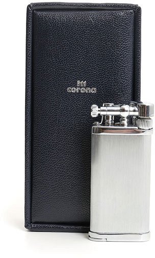 Accendino Im Corona Old Boy in acciaio, di colore cromato satinato, con fiamma orizzontale regolabile per accendere la pipa. Distributore Savinelli. L'accendino è un modello classico ispirato ai modelli degli anni 20 con castelletto di accensione a vista sul serbatoio. Molto piacevole da tenere in mano con una linea essenziale che lo rende elegante e raffinato. L'accensione è a pietrina e non perde un colpo anche con il freddo o in montagna dove solitamente i piezo elettrici funzionano a singhiozzo. Ha un pratico curapipe a scomparsa che si integra perfettamente nel design sempre attuale dell'accendino. Come tutti gli accendini a gas, bisogna caricarlo con gas butano di qualità per evitare che si rovini (si intende il gas tipo Clipper, non le bombolette azzurre). E' corredato di un elegante cofanetto in pelle e sacchettino in velluto. Ha una garanzia di 24 mesi e l'assistenza è assicurata dalla Savinelli. Accendino caro da sempre (nel 86 costava da 82.000 a 115.000 lire), ma ancora oggi il più apprezzato dai fumatori.