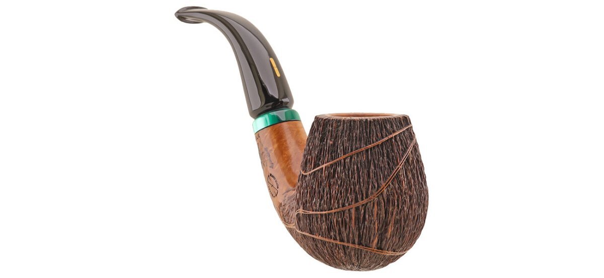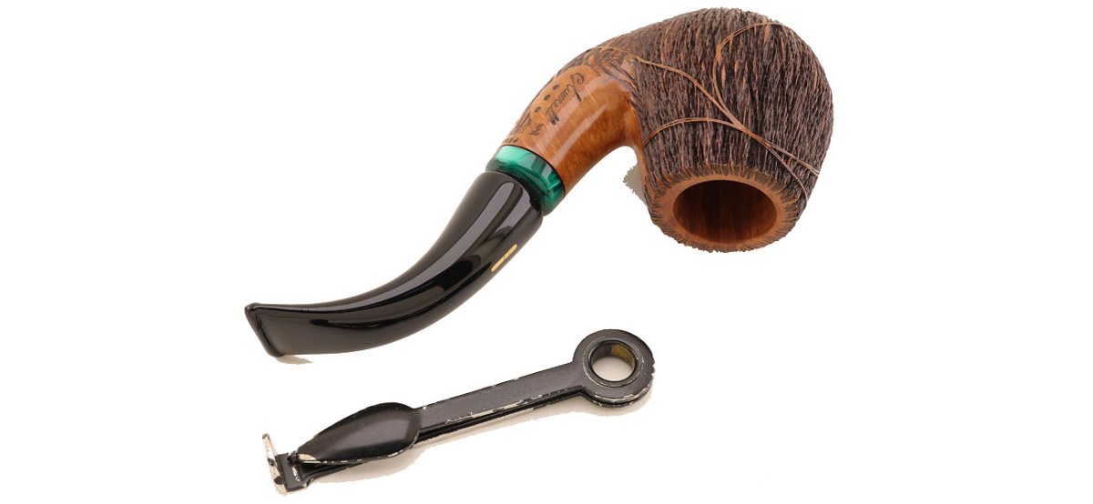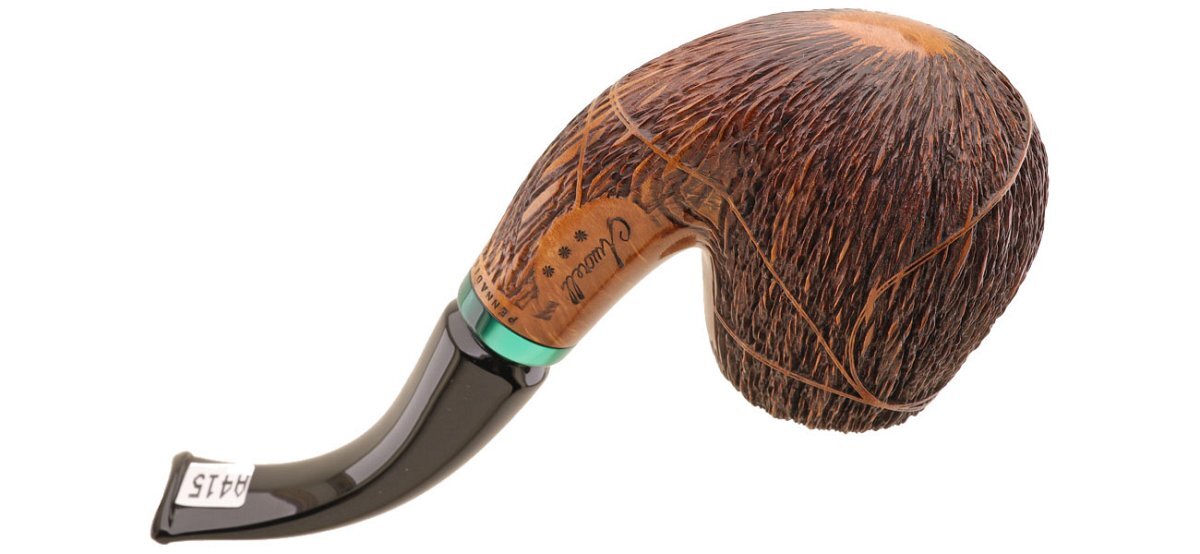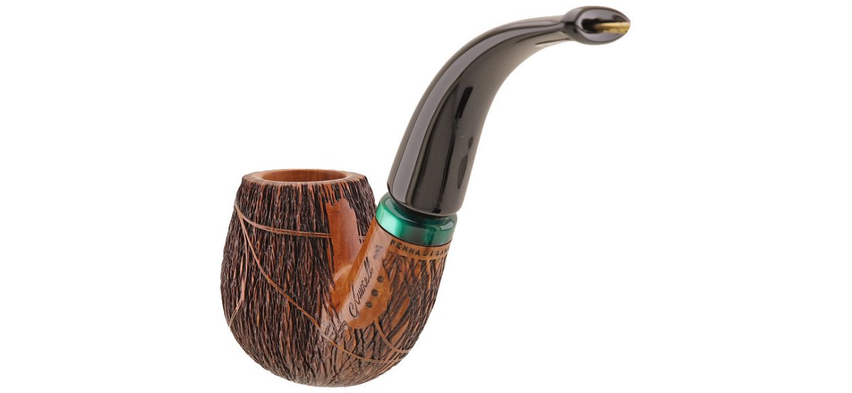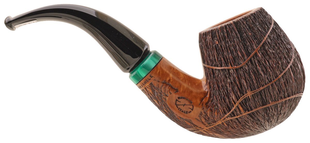 Pipa Amorelli scolpita di colore marrone, modello curvo classico billiard con bocchino in metacrilato di colore nero. Valutazione Penna di San Michele 3A. La pipa è molto elegante e raffinata, una classica sempre attuale con la sua linea pulita ed essenziale non stanca mai. Il modello è la classica billiard con una curvatura molto stretta che ne fa quasi una Oom Paul. Questa sua caratteristica fa si che non pesa mai sui denti e la rende ideale da portare in giro come pipa da tutto giorno. Molto bello l'inserto verde sul bocchino che le dona una classe superiore. La pipa è di medie dimensioni e si contraddistingue per un fornello capace per una fumabilità eccellente in ogni situazione. La leggerezza la rende ideale per ogni fumata che sia a passeggio o comodamente seduti in poltrona. Le Laser Sculture sono quelle pipe che vengono scolpite con il laser. Si creano dei disegni geometrici regolari di grande effetto che, con il passare delle fumate, assume un aspetto arabescato tridimensionale. La lavorazione è lunga e complessa ma il risultato è stupefacente. La pipa è molto piacevole da tenere in mano perchè da una sensazione quasi setosa. Il finissaggio ruvido è l'ideale per i mesi caldi in quanto scalda meno la mano. Ottima da passeggio data la sua minore propensione a righe e bolli. La serie Penna di San Michele riproduce simbolicamente le trame di una piuma. La sua lavorazione è ancora più complessa e lunga rispetto alle altre Laser Sculture. Per realizzarla viene lasciato più materiale sulla pipa che poi viene tolto con tanti passaggi del Laser sulla radica. Il risultato è incredibile e unico.