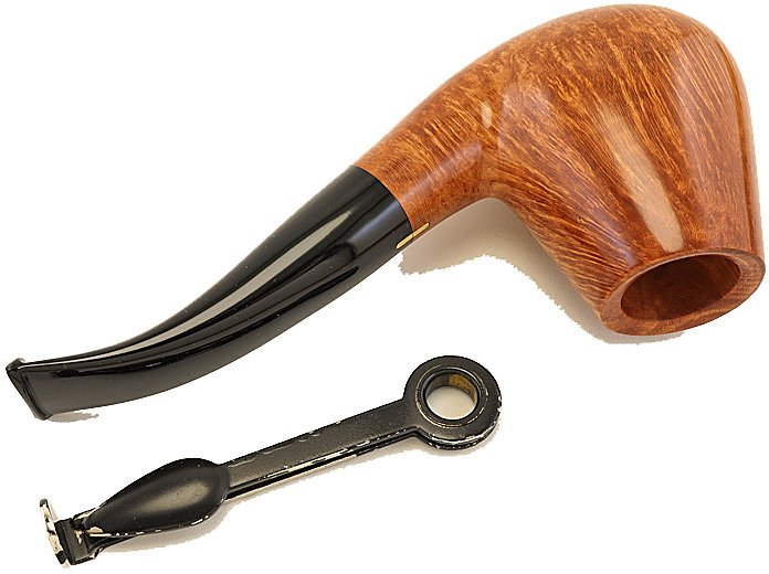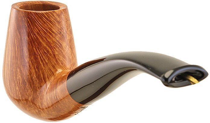 Pipa Amorelli liscia di colore marrone chiaro, modello curvo classico brandy chimney con bocchino in metacrilato nero. Valutazione 1 Asterisco. La pipa è molto elegante e raffinata, con una linea classica sempre attuale che non stanca mai. Ha un grande impatto visivo dato dall'altezza del suo fornello che parte largo sotto e va a stringersi verso l'alto. Il fornello alto ha il vantaggio di donare sempre fumate fresche. Ha una bella fiammatura di taglio tradizionale su un lato del fornello mentre l'altro no ma il disegno del legno è comunque molto piacevole. Pipa favolosa con il fornello leggermente schiacciato sui lati che da una grande soddisfazione a tenere in mano, anche da spenta. La pipa è di grandi dimensioni e si contraddistingue per un fornello più che capace per una fumabilità eccellente in ogni situazione. La leggerezza la rende ideale per ogni fumata che sia a passeggio o comodamente seduti in poltrona. La serie Lisce sono quelle pipe che non presentano difetti e hanno una venatura regolare e fitta man mano che gli asterischi aumentano.