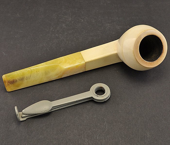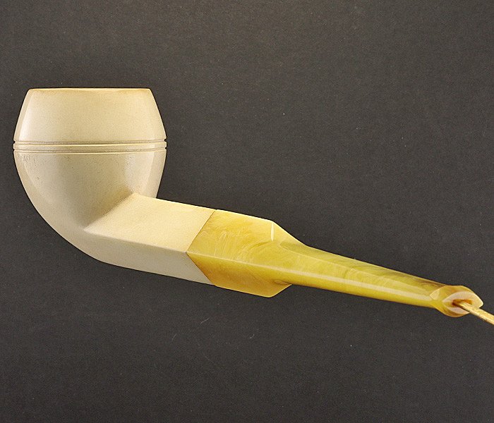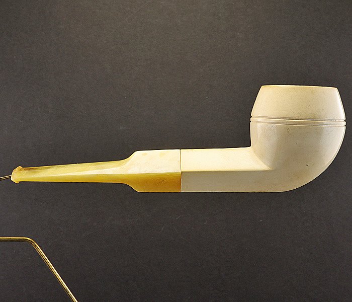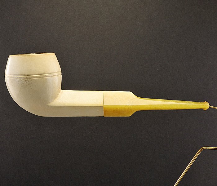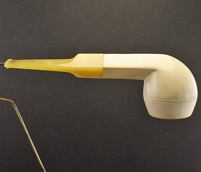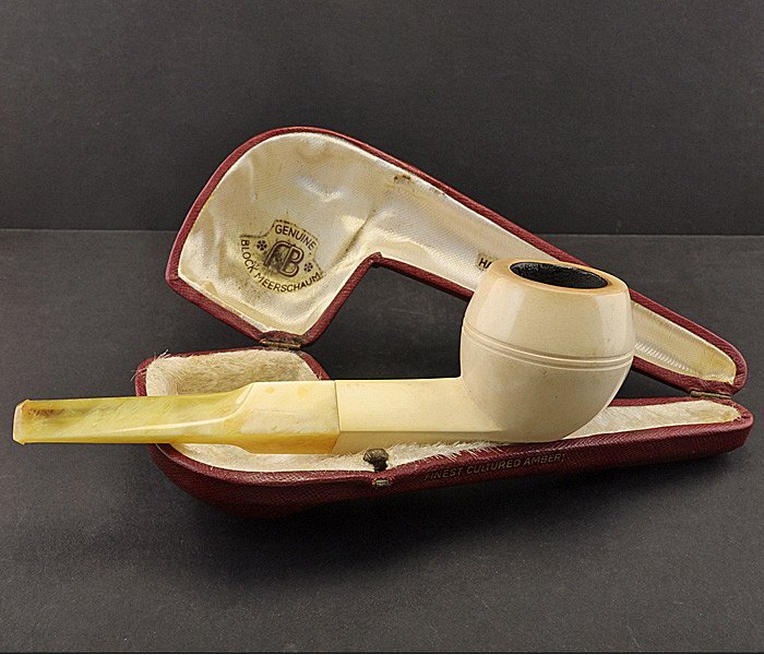Pipa Bauer rodata liscia in schiuma di colore avorio, modello dritto classico bulldog con bocchino tradizionale in ambra coltivata giallo. La pipa è molto elegante e raffinata, il colore chiaro le dona un senso di purezza. La pipa è di medie dimensioni e si contraddistingue per un fornello più che capace per una fumabilità eccellente in ogni situazione. La leggerezza la rende ideale per ogni fumata che sia a passeggio o comodamente seduti in poltrona anche se molti non si arrischiano a portarla in giro. Infatti se una pipa di schiuma cade per terra, si salva solo il bocchino. La caratteristica della schiuma è quello di esaltare il gusto del tabacco, senza aggiungere o togliere niente. Si dice che non ha memoria in quanto, anche cambiando miscela, non lascia spiacevoli residui. Non necessita rodaggio e non subisce bruciature. Il bello della schiuma è vedere, con il passare delle fumate, il cambiamento che subisce. Dal bianco passa all'ambrato, per poi virare al rosa e per, alla fine, diventare marrone. Questa pipa ha già iniziato a cambiare colore passando dal bianco al color avorio. Il bordo del fornello rosa fa intuire che la pipa è stata fumata poco ma bene. Pezzo straordinario che merita sicuramente possedere e che impreziosisce ogni collezione. Pipa molto rara da trovare nel rodato e che è stata prodotta negli anni '80. La pipa è usata, fumata bene e molto poco, principalmente con tabacchi naturali o english mixture. Valutazione 9 su 10. La pipa non ha né sacchetto né scatola originale.