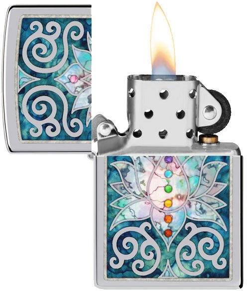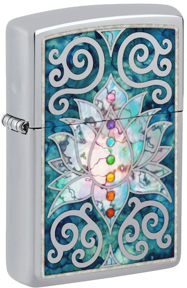 Zippo Regular windproof petrol lighter with brass case with print and steel insert, Lotus Flore Design model. The characteristic feature of this model is the mirror-polished chrome case on the base with an artistic lotus flower image printed on it. A very refined and elegant piece. The flame protection cage makes it very convenient as even in strong winds, the flame does not go out. The lighter's mechanism is very simple, with a steel case filled with cotton wool and a wick made semi-rigid by copper wires, and a flint for the spark. This simplicity means that a Zippo always works, and the company believes in it so much that it has always offered a lifetime guarantee. In the rare event that the lighter breaks down, simply download a form from the Zippo website and send it to Germany, where it will be repaired and returned to the sender free of charge. As with all petrol lighters, there is no flame adjustment and its height depends on the length of the wick. The wick wears out over time and needs to be pulled up from time to time. A Zippo lighter lasts on average a couple of days, but with a few precautions, you can double that. The first thing to do is to add a little cotton to what is already in the lighter so that it is well pressed, and then be careful when putting it in your pocket. If you put it upright, it will last longer. It is important to use only highly clean petrol, and Zippo's is the best. There are other brands on the market, but they are often more oily and, over time, they clog and dirty the mechanism. The Zippo is less suitable for cigars and pipes, for which gas inserts have been created that are more appropriate. The lighter comes with an elegant original gift box.