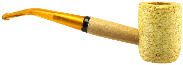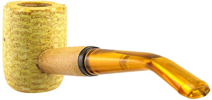 Pipa Missouri Meerschaum liscia di colore giallo paglierino, modello semi curvo classico tipo billiard con bocchino in plastica giallo. Valutazione Legend. La pipa è molto allegra e disinvolta, con una linea originale che nel tempo è diventata un classico. La pipa è fatta di pannocchia dalla leggendaria The Missouri Meerschaum Company, che coltiva direttamente le pannocchie e poi le lavora nella sua fabbrica nata più di 150 anni fa. Dopo averle lasciate asciugare e seccare per oltre due anni, vengono lavorati i fornelli e divisi per misura. Successivamente il fornello viene spalmato di gesso che, una volta asciutto, viene levigato per rendere la pipa più resistente nel tempo. Infine la pipa viene montata con il cannello in legno ed il bocchino in plastica. Un anello in metallo sul cannello contribuisce a renderlo più solido. Alcune serie vengono anche spruzzate con un sottile strato di lacca per un risultato più “splendente”. La pipa finita è dura e resistente, pronta per entrare in azione. E’ un classico, specialmente nei mesi estivi, perché fresca, poco impegnativa ed economica. Il gusto della fumata è unico con sentori di meliga che si mischiano a quello del nostro tabacco. La sensazione è particolare ma molto gradevole. Meno piacevole il bocchino in plastica indipendentemente dalla qualità della fattura. La pipa è di medie dimensioni e si contraddistingue per un fornello discreto e una fumabilità eccellente in ogni situazione. La leggerezza la rende ideale per ogni fumata che sia a passeggio o comodamente seduti in poltrona.