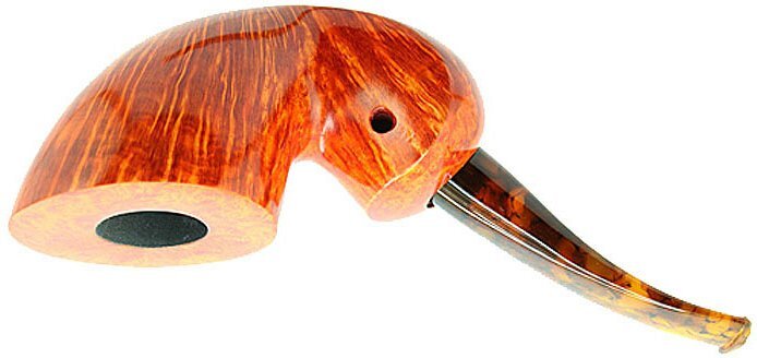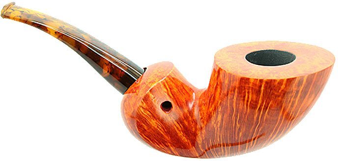 Pipa Peter Klein liscia di colore arancione, modello curvo forma libera con bocchino in metacrilato tartarugato. La pipa è molto elegante e raffinata, con una fiammatura fitta e un bellissimo occhio di pernice sul bordo del fornello e sotto, che dona alla pipa una classe superiore. La pipa è di medie dimensioni e si contraddistingue per un fornello capace per una fumabilità eccellente in ogni situazione. La leggerezza la rende ideale per ogni fumata che sia a passeggio o comodamente seduti in poltrona. Il modello si chiama "Beccaccia" perchè se si capovolge, somiglia alla testa dell'uccello con il bocchino che fa da becco.