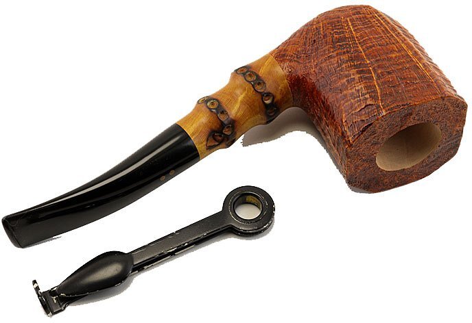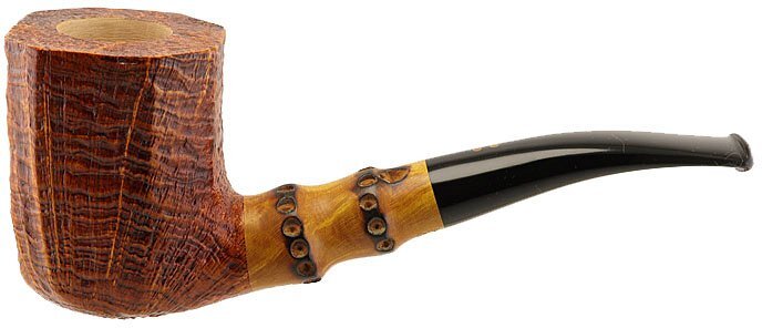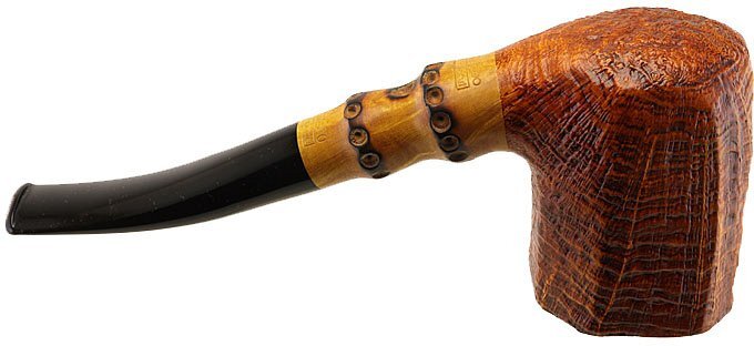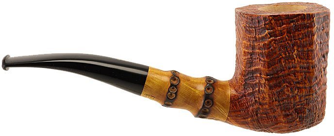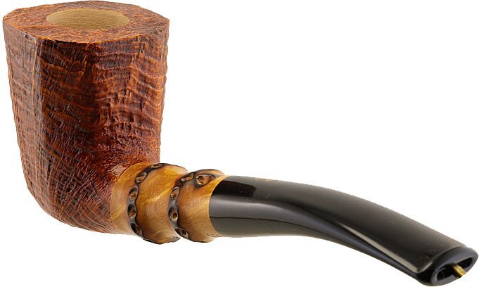 Pipa Radice Silk Cut sabbiata di colore marrone, modello curvo classico billiard panel con bocchino in metacrilato nero. La pipa ha una linea classica che la rende molto elegante, con il cannello lavorato tipo bamboo che le dona una classe superiore. La pipa è di grandi dimensioni e si contraddistingue per un fornello capace per una fumabilità eccellente in ogni situazione. La sua leggerezza la rende ideale per ogni fumata che sia a passeggio o comodamente seduti in poltrona. Il fornello panel ottagonale presenta una bellissima fiammatura molto fitta esaltata dalla fine sabbiatura. Pezzo incredibile. La serie Silk Cut rappresenta quelle pipe con piccoli difetti nella radica e una bella venatura regolare. La sabbiatura è fatta colpendo la pipa con dei minuscoli grani di silice ad un elevata pressione che scavano la parte tenera della radica creando il disegno particolare della pipa sabbiata. E' la pipa più sana in quanto se le piccole crepe fossero passanti, la silice forerebbe il ciocco immediatamente. La lavorazione è lunga e difficile da eseguire ma da un risultato finale di sicuro effetto. La qualità è uguale a tutte le altre Radice. E’ disponibile nei colori nocciola, marrone, nero, rosso e naturale. Pipa ideale per i mesi caldi in quanto scalda meno la mano. Ottima da passeggio data la sua minore propensione a righe e bolli. La Radice è uno degli artigiani italiani con il miglior rapporto qualità/prezzo.