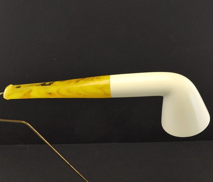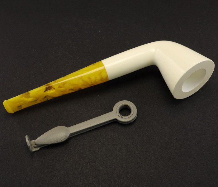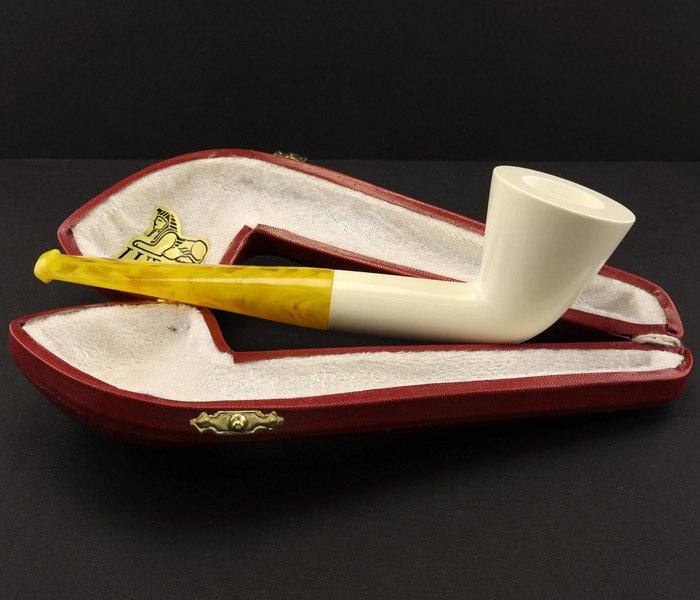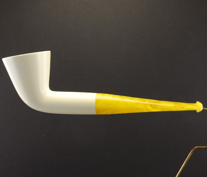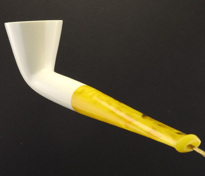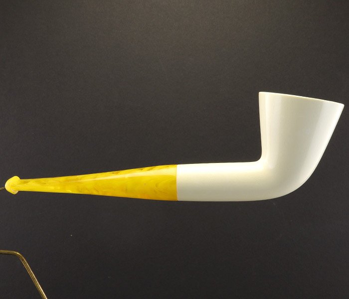Pipa di Schiuma liscia pura di colore bianco, modello dritto classico canted dublin con bocchino tradizionale in metacrilato giallo striato tipo ambra. Gruppo di valutazione 6. La pipa è molto elegante e raffinata, il colore bianco esalta la sua purezza. Questo modello è caratterizzato dal fornello inclinato in avanti che dona alla pipa un senso di movimento. La mancanza di imperfezioni la rende quasi scintillante. Il bocchino è di un colore stupendo e le dona una classe superiore. La pipa è di piccole dimensioni e si contraddistingue per un fornello discreto per una fumabilità eccellente in ogni situazione. La leggerezza la rende ideale per ogni fumata che sia a passeggio o comodamente seduti in poltrona anche se molti non si arrischiano a portarla in giro. Infatti se una pipa di schiuma cade per terra, si salva solo il bocchino. La caratteristica della schiuma è quello di esaltare il gusto del tabacco, senza aggiungere o togliere niente. Si dice che non ha memoria in quanto, anche cambiando miscela, non lascia spiacevoli residui. Non necessita rodaggio e non subisce bruciature. Il bello della schiuma è vedere, con il passare delle fumate, il cambiamento che subisce. Dal bianco passa all'ambrato, per poi virare al rosa e per, alla fine, diventare marrone. Pipa ideale per chi si volesse avvicinare al favoloso mondo delle Meerschaum avendo un prodotto di prima qualità ma dal prezzo contenuto.