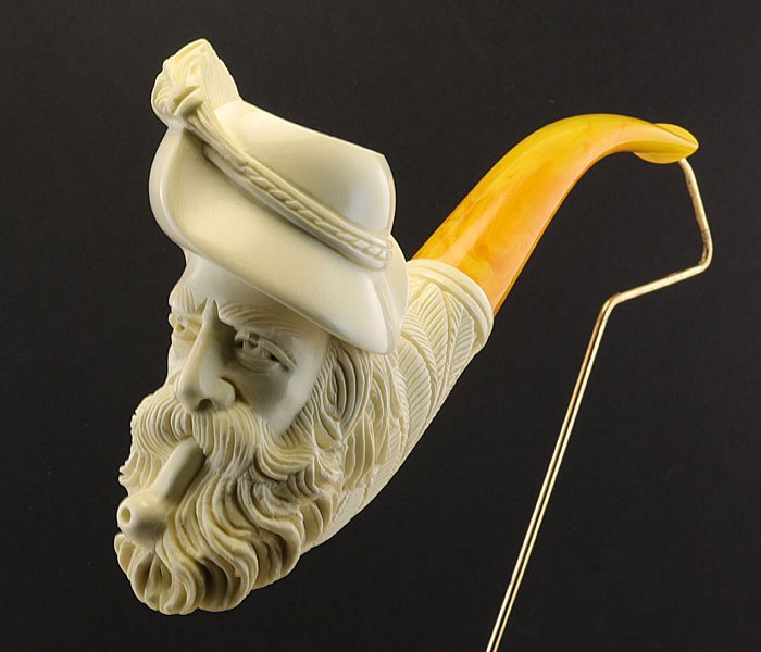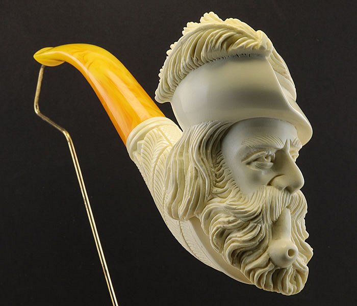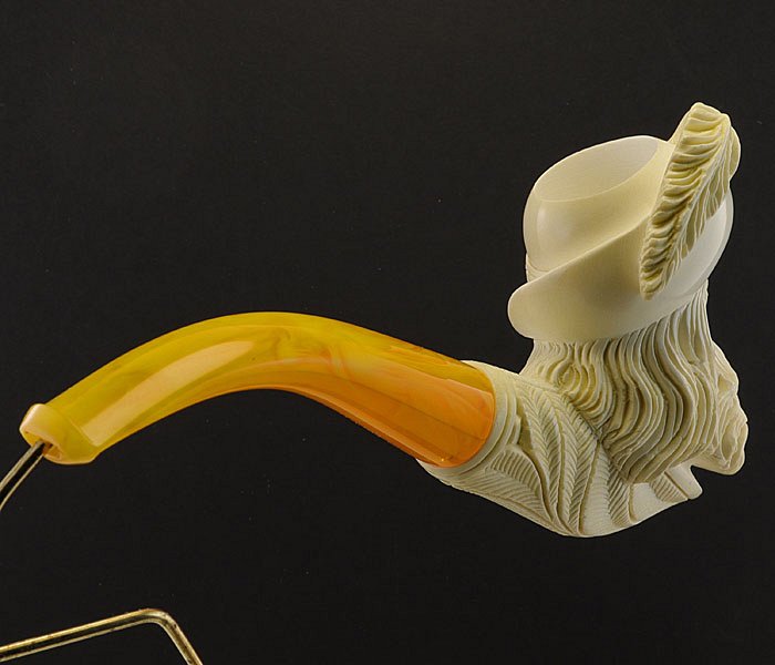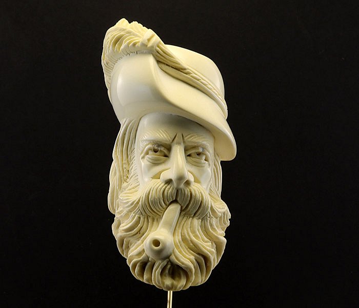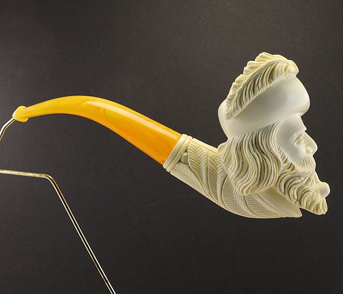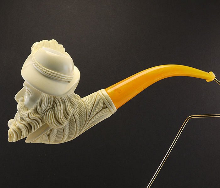 Pipa di Schiuma Scolpita di colore bianco, modello raffigurante la testa di un Bavarese con bocchino tradizionale in metacrilato giallo striato tipo ambra. Valutazione Figurata Grande. La pipa è molto elegante e raffinata, il colore bianco le dona un senso di purezza. E' stata scolpita a mano da esperti artigiani turchi che ne fa una vera opera d'arte. La pipa è di generose dimensioni e si contraddistingue per un fornello più che generoso per una fumabilità eccellente in ogni situazione. La leggerezza la rende ideale per ogni fumata che sia a passeggio o comodamente seduti in poltrona anche se molti non si arrischiano a portarla in giro. Infatti se una pipa di schiuma cade per terra, si salva solo il bocchino. La caratteristica della schiuma è quello di esaltare il gusto del tabacco, senza aggiungere o togliere niente. Si dice che non ha memoria in quanto, anche cambiando miscela, non lascia spiacevoli residui. Non necessita rodaggio e non subisce bruciature. Il bello della schiuma è vedere, con il passare delle fumate, il cambiamento che subisce. Dal bianco passa all'ambrato, per poi virare al rosa e per, alla fine, diventare marrone. A seconda dello spessore cambia la sfumatura del colore e per queste pipe scolpite, dona loro maggiore profondità.