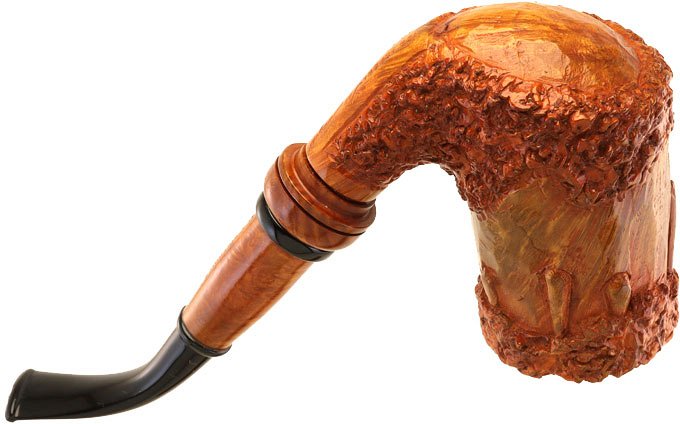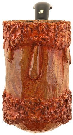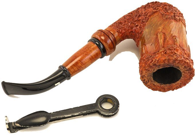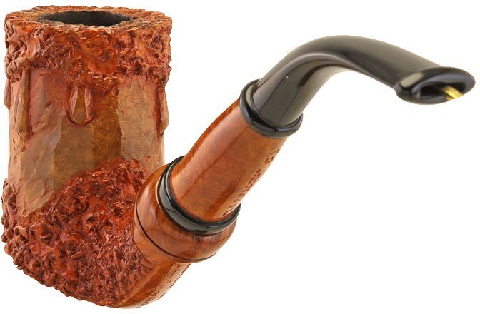 Pipa Ser Jacopo rodata scolpita di colore marrone chiaro, modello classico chimney curvo con bocchino in metacrilato nero. Valutazione La Pipaccia 03. La pipa ha un grande impatto visivo dato dalla sua lavorazione particolare ed unica. La fine scolpitura è molto piacevole al tatto ma senza la ruvidità delle rusticate. Pezzo molto elegante e raffinato che appaga l'occhio e la mano. Il modello è classicissimo, sempre attuale, che non stanca mai. E' di medie/grandi dimensioni e si contraddistingue per un fornello più che capace che garantisce una fumabilità eccellente in ogni situazione. La leggerezza la rende ideale per ogni fumata che sia a passeggio o comodamente seduti in poltrona. Il fornello alto regala fumate sempre fresche. La serie Pipaccia è stata creata da Giancarlo Guidi negli anni '80 ed era composta da tre modelli che avevano in comune la minuziosa lavorazione che consisteva nella scolpiura a mano in modo da sembrare ina candela con le colature della cera sui lati del fornello. La lavorazione è molto lunga e faticosa ma il risultato è di sicuro effetto. Pipa ideale per i mesi caldi in quanto scalda meno la mano. Ottima da passeggio data la sua minore propensione a righe e bolli. Pipa dalla linea importante ed originale che mette in risalto le capacità artigiane della Ser Jacopo. La pipa è usata, fumata bene e molto molto poco, principalmente con tabacchi naturali o english mixture. Valutazione 9.5 su 10. La pipa non ha né sacchetto né scatola originale.
