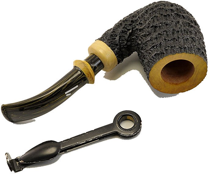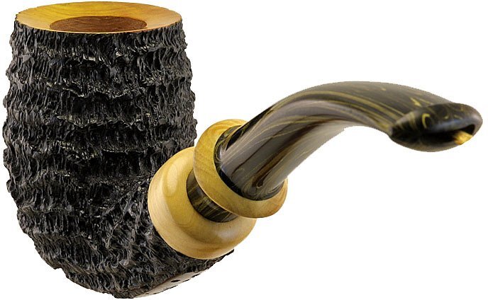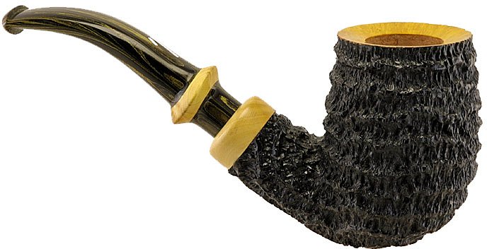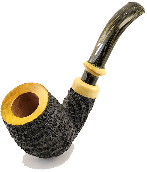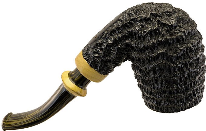 Pipa Sesa sabbiata di colore nero, modello classic billiard curvo con bocchino in ebanite variegato grigio/ocra. Valutazione 3 Asterischi. La pipa è molto elegante e raffinata, con una rusticatura originale, profonda e simmetrica, che ricorda la sabbiatura di Werner Mummert. Il risultato è d'effetto, con la superficie che ricorda le Bee Hive, che sfrutta il principio delle lamelle del cilindro e raffreddano meglio la pipa. La mano non sarà mai calda e la fumata molto piacevole. La lavorazione è lunga e completa ma il risultato la porta ad un livello superiore. Il bocchino in ebanite tedesca ha una colorazione variegata bellissima che dona alla pipa una classe superiore. Molto bello anche l'intero in bosso di quest'ultimo. La pipa è di medie/grandi dimensioni e si contraddistingue per un fornello più che capace per una fumabilità eccellente in ogni situazione. La leggerezza la rende ideale per ogni fumata che sia a passeggio o comodamente seduti in poltrona. E' un modello classico che rimane sempre attuale e piacevole da tenere in mano e da fumare.