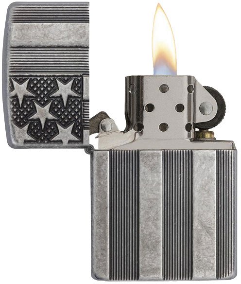 Accendino Zippo Armor antivento a benzina con cassa in ottone e inserto in acciaio, modello US Flag. La caratteristica di questo modello è la cassa Armor che è più spessa della regular e permette incisioni più profonde per un risultato con maggiore profondità e maggiori dettagli del normale. La lavorazione è diel disegno della bandiera americana su base di color antique silver. Pezzo straordinario dove la profondità dell'incisione fa la differenza. Il castelletto a protezione della fiamma lo rendono molto comodo in quanto anche in presenza di vento forte, la fiamma non si spegne. La meccanica dell’accendino è molto semplice, con una cassa in acciaio piena di ovatta e di uno stoppino reso semi rigido da fili di rame, una pietra focaia per la scintilla. Questa semplicità fa si che uno Zippo funziona sempre e la ditta ci crede talmente che, da sempre, ha una garanzia a vita. Nel raro caso che l’accendino si guastasse, basta scaricare un modulo sul sito della Zippo e spedirlo in Germania dove viene riparato e rispedito al mittente gratis. Come per tutti gli accendini a benzina non c’è la regolazione della fiamma e la sua altezza dipende dalla lunghezza dello stoppino. Lo stoppino si consuma nel tempo e bisogna, ogni tanto, tirarlo su. La carica dello Zippo dura mediamente un paio di giorni ma con alcune accortezze si può arrivare anche al doppio. La prima cosa da fare è aggiungere un po' di cotone a quello già nell’accendino in modo che sia ben pressato e poi fare attenzione quando si mette in tasca. Se lo si mette verticale la carica dura di più. E’ importante usare solo benzina altamente pulita e quella della Zippo è la migliore. Ci sono altri marchi sul mercato ma spesso sono più grasse e col tempo impastano e sporcano il meccanismo. Lo Zippo è meno indicato per sigari e pipe, per i quali sono stati creati degli inserti a gas che fanno al caso loro. L’accendino è corredato da una elegante scatola regalo originale.