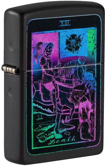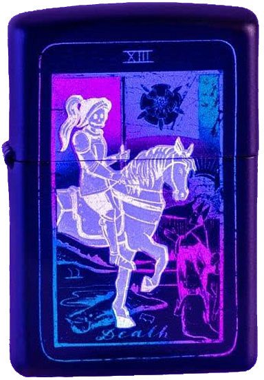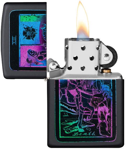 Accendino Zippo Regular antivento a benzina con cassa in ottone verniciato nero opaco e inserto in acciaio, modello Tarot Card Design. La caratteristica di questo modello è la cassa verniciata di nero con stampato una carta dei tarocchi. Questo disegno è stato creato con un inchiostro che esposto ai raggi UV rivela dei dettagli bluastri del disegno. Il castelletto a protezione della fiamma lo rendono molto comodo in quanto anche in presenza di vento forte, la fiamma non si spegne. La meccanica dell’accendino è molto semplice, con una cassa in acciaio piena di ovatta e di uno stoppino reso semi rigido da fili di rame, una pietra focaia per la scintilla. Questa semplicità fa si che uno Zippo funziona sempre e la ditta ci crede talmente che, da sempre, ha una garanzia a vita. Nel raro caso che l’accendino si guastasse, basta scaricare un modulo sul sito della Zippo e spedirlo in Germania dove viene riparato e rispedito al mittente gratis. Come per tutti gli accendini a benzina non c’è la regolazione della fiamma e la sua altezza dipende dalla lunghezza dello stoppino. Lo stoppino si consuma nel tempo e bisogna, ogni tanto, tirarlo su. La carica dello Zippo dura mediamente un paio di giorni ma con alcune accortezze si può arrivare anche al doppio. La prima cosa da fare è aggiungere un po' di cotone a quello già nell’accendino in modo che sia ben pressato e poi fare attenzione quando si mette in tasca. Se lo si mette verticale la carica dura di più. E’ importante usare solo benzina altamente pulita e quella della Zippo è la migliore. Ci sono altri marchi sul mercato ma spesso sono più grasse e col tempo impastano e sporcano il meccanismo. Lo Zippo è meno indicato per sigari e pipe, per i quali sono stati creati degli inserti a gas che fanno al caso loro. L’accendino è corredato da una elegante scatola regalo originale.