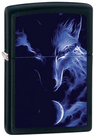 Accendino Zippo Regular antivento a benzina con cassa in ottone verniciato nero opaco e inserto in acciaio, modello Wolf Design. La caratteristica di questo modello è la cassa verniciata di nero con stampata la testa di un lupo. Questo disegno è stato creato con un inchiostro che esposto ai raggi UV rivela dei dettagli bluastri del disegno. Il castelletto a protezione della fiamma lo rendono molto comodo in quanto anche in presenza di vento forte, la fiamma non si spegne. La meccanica dell’accendino è molto semplice, con una cassa in acciaio piena di ovatta e di uno stoppino reso semi rigido da fili di rame, una pietra focaia per la scintilla. Questa semplicità fa si che uno Zippo funziona sempre e la ditta ci crede talmente che, da sempre, ha una garanzia a vita. Nel raro caso che l’accendino si guastasse, basta scaricare un modulo sul sito della Zippo e spedirlo in Germania dove viene riparato e rispedito al mittente gratis. Come per tutti gli accendini a benzina non c’è la regolazione della fiamma e la sua altezza dipende dalla lunghezza dello stoppino. Lo stoppino si consuma nel tempo e bisogna, ogni tanto, tirarlo su. La carica dello Zippo dura mediamente un paio di giorni ma con alcune accortezze si può arrivare anche al doppio. La prima cosa da fare è aggiungere un po' di cotone a quello già nell’accendino in modo che sia ben pressato e poi fare attenzione quando si mette in tasca. Se lo si mette verticale la carica dura di più. E’ importante usare solo benzina altamente pulita e quella della Zippo è la migliore. Ci sono altri marchi sul mercato ma spesso sono più grasse e col tempo impastano e sporcano il meccanismo. Lo Zippo è meno indicato per sigari e pipe, per i quali sono stati creati degli inserti a gas che fanno al caso loro. L’accendino è corredato da una elegante scatola regalo originale.